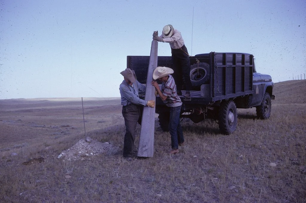 Unloading NWMP Marker from Fort Walsh truck - Alex McKelvey - Reddy Parsonage & Bob Orchard. Consul, 1961.” Everett Baker Slides.”